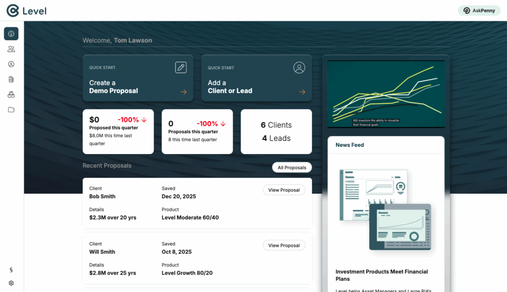Take your firm to the next Level with our groundbreaking Client Engagement tool. In a digital-first world, Level lets you stay engaged digitally and meet your clients where they want to be met…online, on their time, on their phone in line at Starbucks. Digital tools allow you to prospect 24/7, scale on existing platforms, enter new markets, gain invaluable data for marketing, product design and sales strategy.